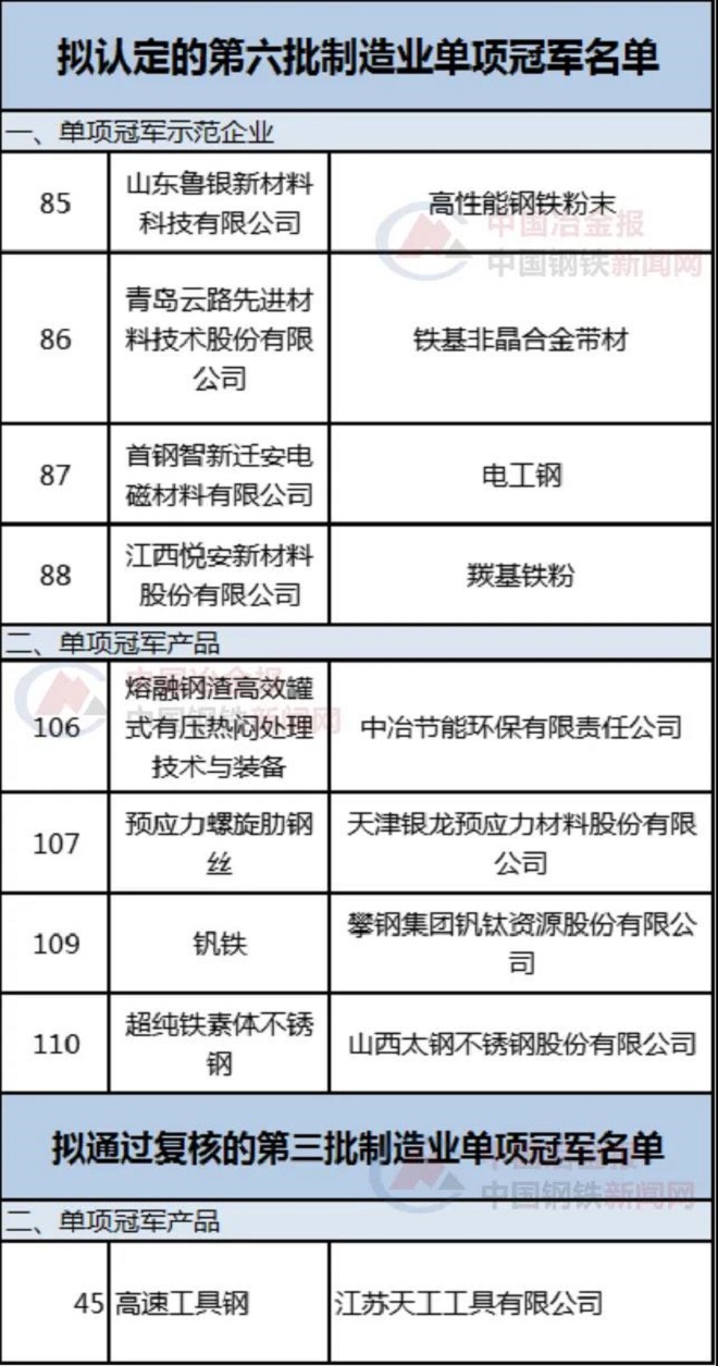 從《公示》中獲悉,此次製造業單項冠軍名單包括單項冠軍示範企業和單項冠軍產品兩個類別,其中涉及鋼鐵行業的單項冠軍整理如下: