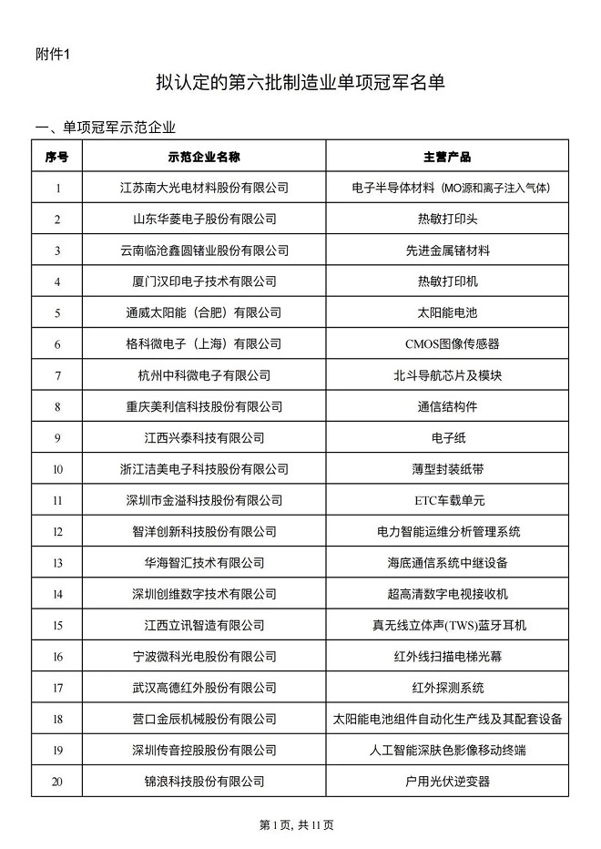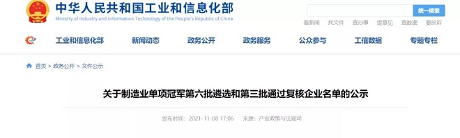 11月8日,工信部發布了《關於製造業單項冠軍第六批遴選和第三批通過複核企業名單的公示》(以下簡稱“《公示》”)。《公示》稱,根據《製造業單項冠軍企業培育提升專項行動實施方案》(工信部產業〔2016〕105號)、《工業和信息化部辦公廳 中國工業經濟聯合會關於組織推薦第六批製造業單項冠軍和複核第三批製造業單項冠軍的通知》(工信廳聯政法函〔2021〕95號),現將擬認定的第六批製造業單項冠軍和擬通過複核的第三批製造業單項冠軍名單予以公示,公示時間為2021年11月8日至11月15日。