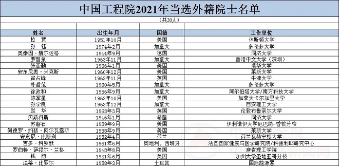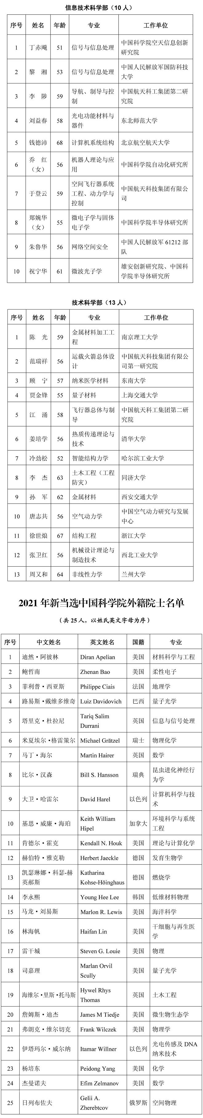 以下為中國科學院、中國工程院2021年當選院士完整名單:
