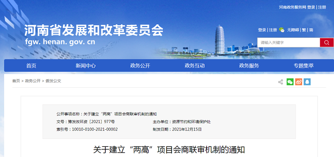 《通知》中表示,為貫徹黨中央、國務院堅決遏製“兩高”項目盲目發展的要求,落實《河南省堅決遏製“兩高”項目盲目發展行動方案》,規範“兩高”項目論證程序,嚴格新建項目準入,經河南省政府同意,河南省發展改革委會同河南省工業和信息化廳、河南省自然資源廳、河南省生態環境廳建立“兩高”項目會商聯審機製。