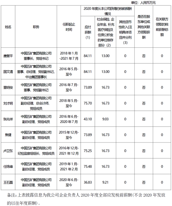 中國五礦集團有限公司企業負責人2020年度薪酬情況