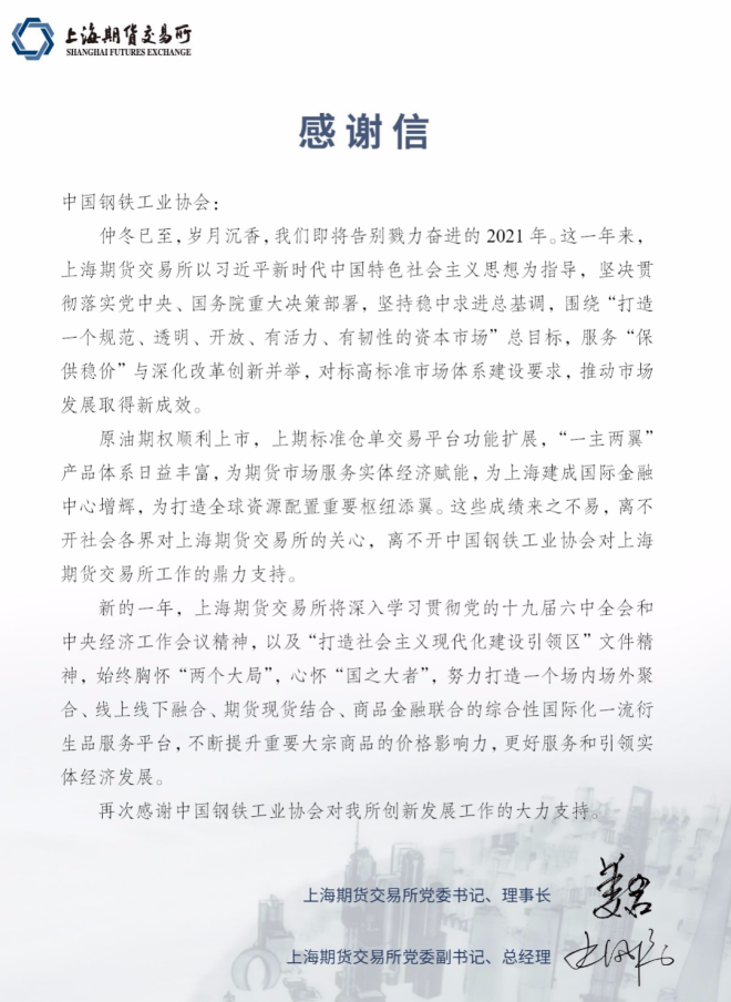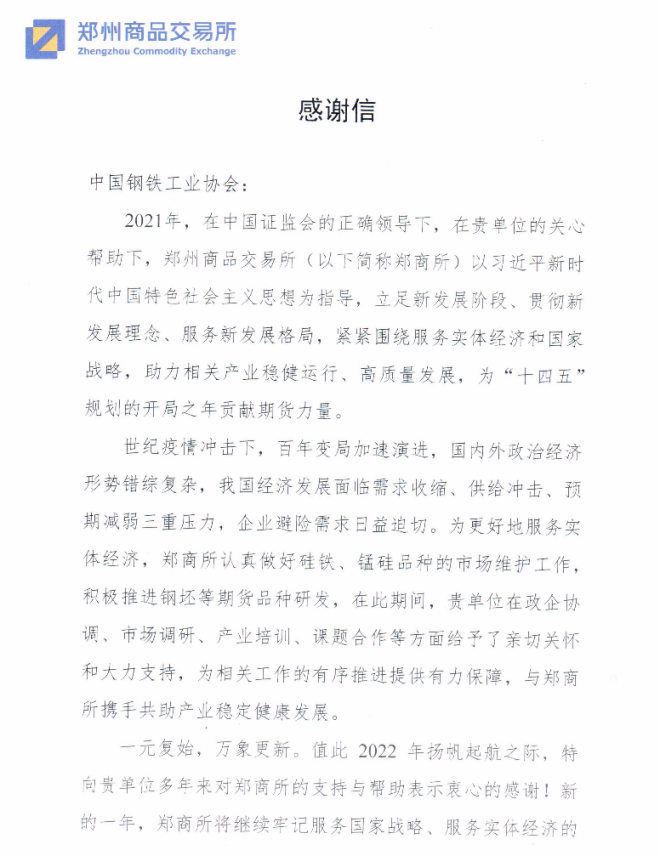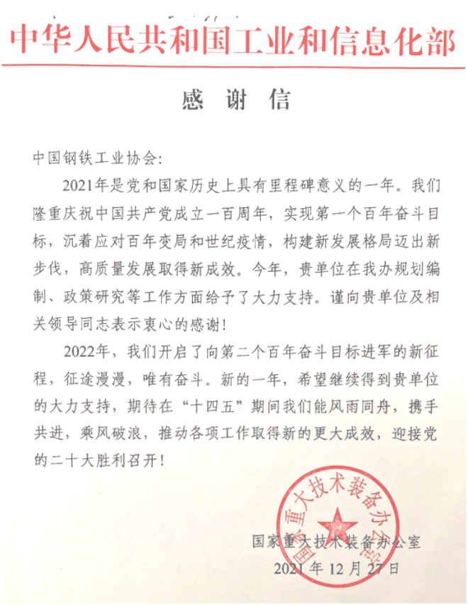歲序更替,新元肇啟。歲末年初,工信部國家重大技術裝備辦公室、生態環境部大氣環境司、國資委管理局、中國工業經濟聯合會、河鋼集團、上海期貨交易所、鄭州商品交易所等向中國鋼鐵工業協會發來感謝信,對鋼協2021年在積極配合支持相關工作、凝聚行業發展共識、促進行業健康發展、支持規劃編製和政策研究、促進行業超低排放改造等方麵發揮的作用給予高度評價,對鋼協提供的大力支持表示誠摯感謝。