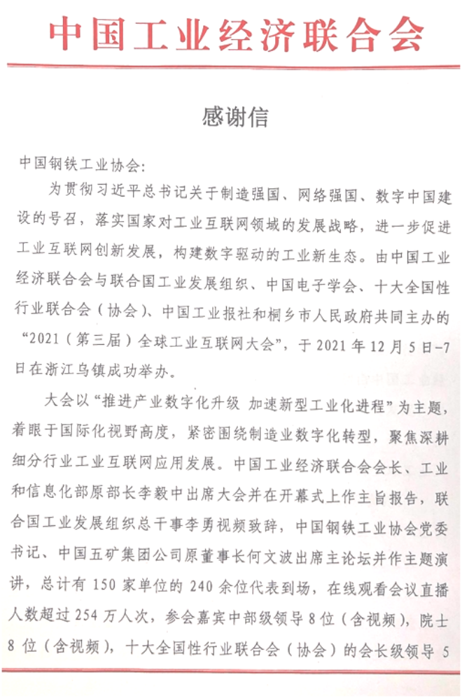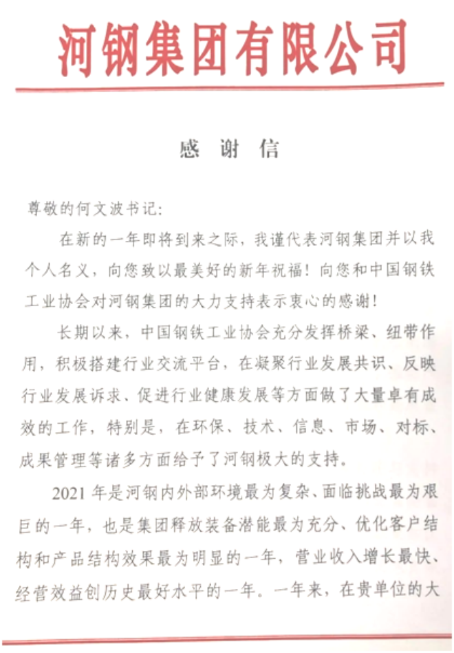 工信部、生態環境部、國資委、河鋼等向中國鋼鐵工業協會發來感謝信
