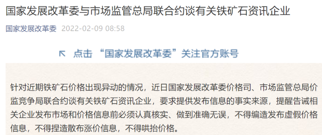 今日一早,國家發展改革委官微發布消息,針對近期鐵礦石價格出現異動的情況,近日國家發展改革委價格司、市場監管總局價監競爭局聯合約談有關鐵礦石資訊企業,要求提供發布信息的事實來源,提醒告誡相關企業發布市場和價格信息前必須認真核實、做到準確無誤,不得編造發布虛假價格信息,不得捏造散布漲價信息,不得哄抬價格。