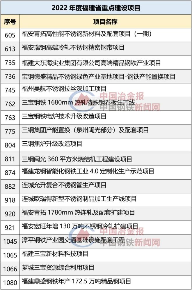 近日,福建發布了2022年度省重點項目名單,其中2022年省重點建設項目共1587項,涉及三鋼、寶鋼、三寶鋼鐵、福建龍鋼、鼎盛鋼鐵等多個鋼企的20個鋼鐵項目!