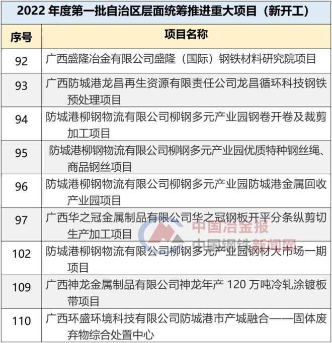 在新開工的190個重大項目中,涉及防城港市9個鋼鐵項目,具體名單整理如下——