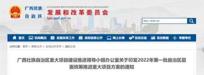近日,廣西壯族自治區發展和改革委員會網站發布了《廣西壯族自治區重大項目建設推進領導小組辦公室印發2022年第一批自治區層麵統籌推進重大項目方案的通知》。據統計,共涉及1996個項目,總投資37826.2億元,年度計劃投資4007.9億元。其中,新開工項目190個,總投資3447.8億元,年度計劃投資282.8億元。