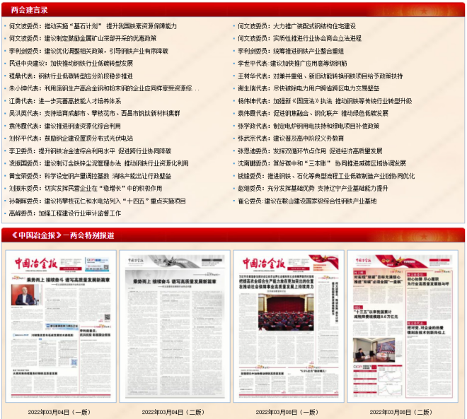 每(mei)年(nian)兩(liang)會(hui),來(lai)自(zi)鋼(gang)鐵(tie)行(xing)業(ye)的(de)代(dai)表(biao)和(he)委(wei)員(yuan)們(men)認(ren)真(zhen)履(lv)職(zhi),積(ji)極(ji)建(jian)言(yan)獻(xian)策(ce),為(wei)行(xing)業(ye)高(gao)質(zhi)量(liang)發(fa)展(zhan)提(ti)出(chu)各(ge)項(xiang)建(jian)議(yi)。今(jin)年(nian)的(de)兩(liang)會(hui)已(yi)經(jing)結(jie)束(shu)。兩(liang)會(hui)期(qi)間(jian),來(lai)自(zi)鋼(gang)鐵(tie)行(xing)業(ye)的(de)全(quan)國(guo)人(ren)大(da)代(dai)表(biao)、政協委員重點圍繞了行業雙碳、雙控、資源保障、產業鏈合作、行業布局兼並重組、科技創新等重點問題談了觀點及相關的建議。