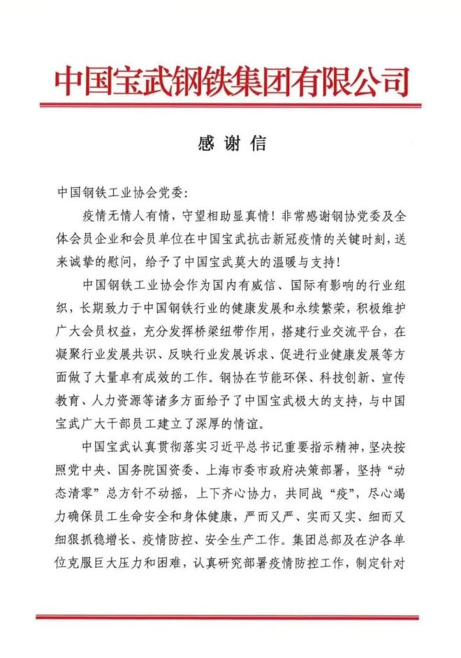 4月15日,中國寶武集團向中國鋼鐵工業協會黨委發來感謝信。