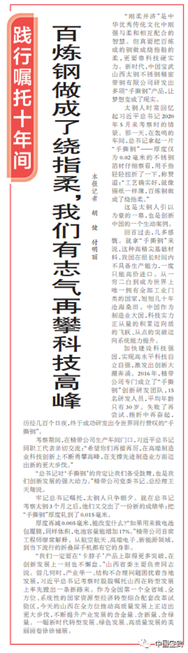 5月26日,人民日報刊發《百煉鋼做成了繞指柔,我們有誌氣再攀科技高峰》,講述習近平總書記2020年考察調研太鋼時稱讚的“手撕鋼”產品,以及太鋼牢記習近平總書記囑托,隻爭朝夕、再創佳績的故事。我們一起來看這篇報道——