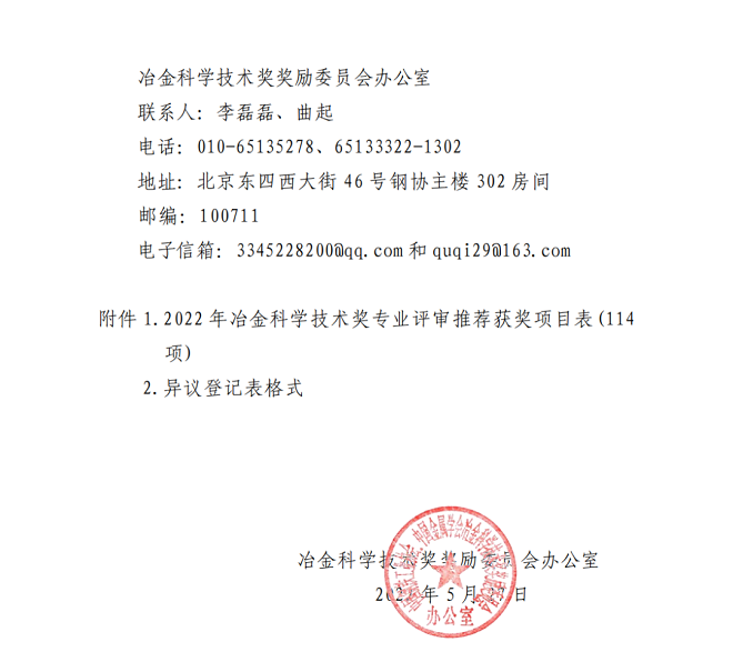 凡fan對dui公gong告gao項xiang目mu有you異yi議yi的de,應ying在zai公gong告gao期qi內nei提ti出chu。個ge人ren異yi議yi應ying署shu真zhen實shi姓xing名ming,單dan位wei異yi議yi須xu加jia蓋gai法fa人ren單dan位wei公gong章zhang。異yi議yi者zhe應ying按an照zhao規gui定ding的de格ge式shi填tian寫xie異yi議yi登deng記ji表biao,並bing提ti供gong正zheng確que有you效xiao的de聯lian係xi方fang式shi和he相xiang應ying的de客ke觀guan證zheng明ming材cai料liao。異yi議yi登deng記ji表biao連lian同tong有you關guan材cai料liao電dian子zi版ban及ji紙zhi件jian(一式兩份),請於2022年6月15日前報送至冶金科學技術獎獎勵委員會辦公室。逾期的異議一般不予受理。
