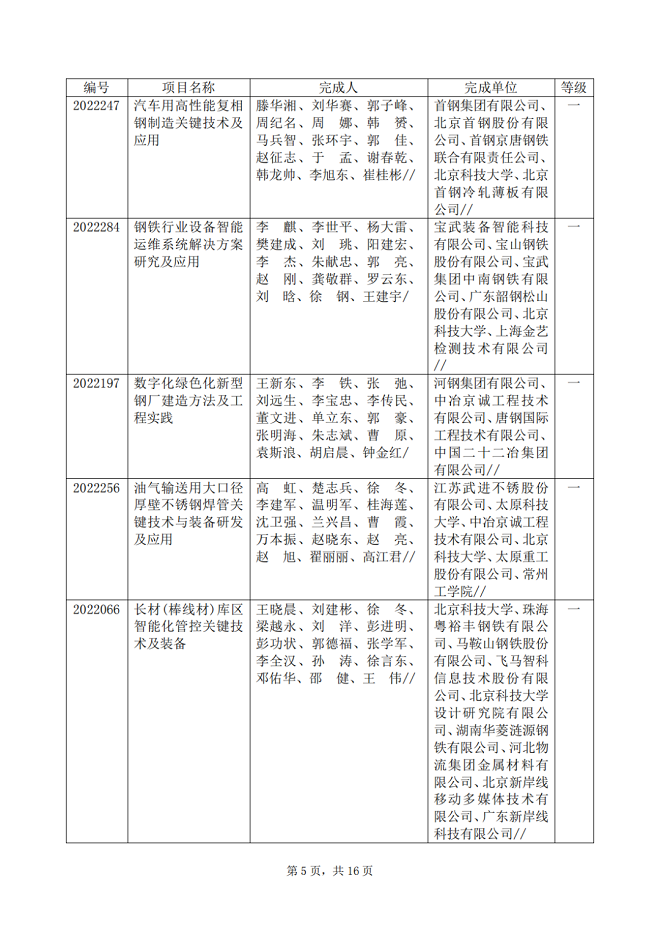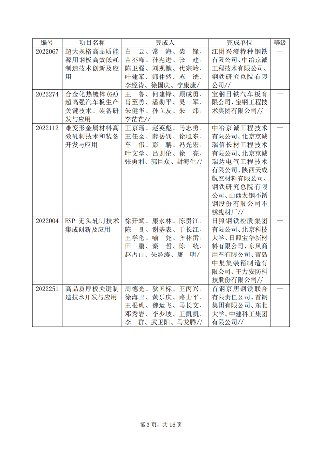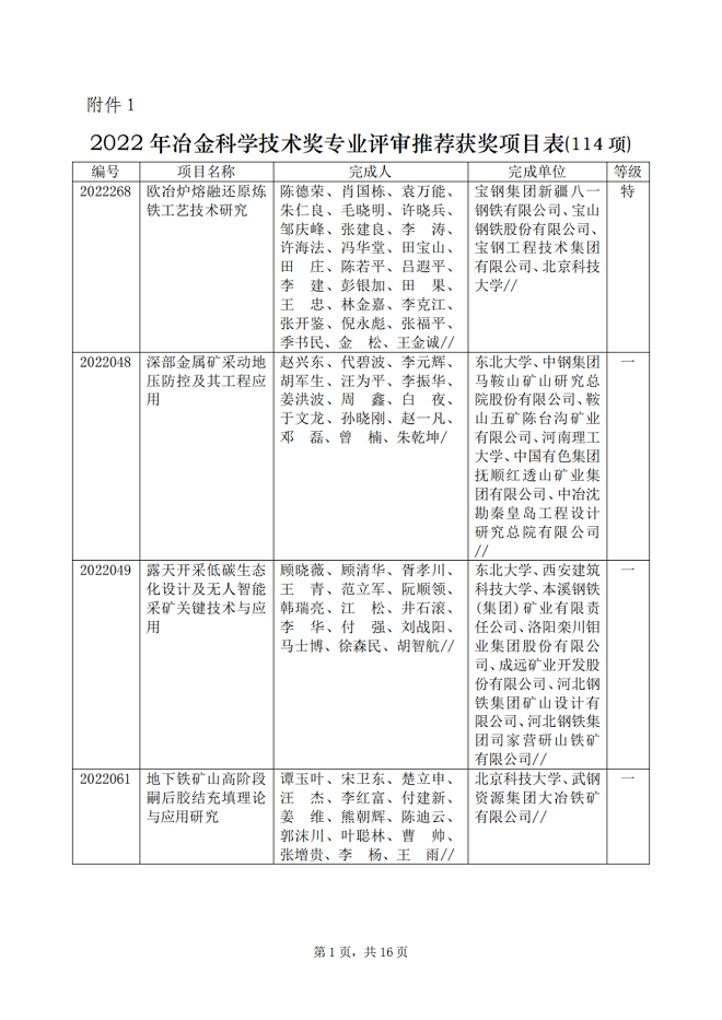 2022年中國鋼鐵工業協會、中國金屬學會冶金科學技術獎(簡稱冶金科學技術獎)專業評審工作已經結束,共推薦獲獎項目114項,其中:特等獎1項,一等獎28項,二等獎26項,三等獎59項。根據評審程序,現將專業評審推薦獲獎項目的名稱、完成單位、完成人、推薦等級等向社會公告。
