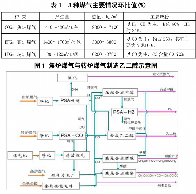 鋼焦融合可實現煤氣資源的高效利用——製造化工產品。鋼焦融合企業產生的焦爐煤氣、高爐煤氣、轉爐煤氣具有各自的發生量、熱值、成分和性能特點(見表1)。