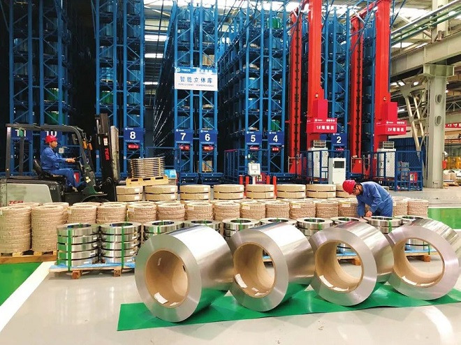 圖為中國寶武太鋼不鏽鋼精密帶鋼有限公司生產車間,工人們正在對“手撕鋼”產品進行裝運