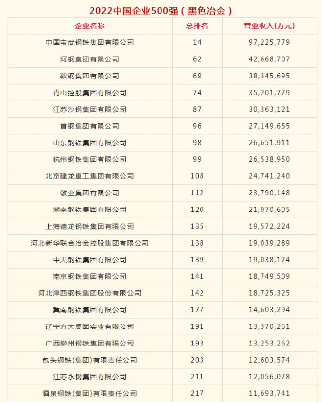 重磅!2022中國企業500強出爐!中國鋼鐵哪家強?