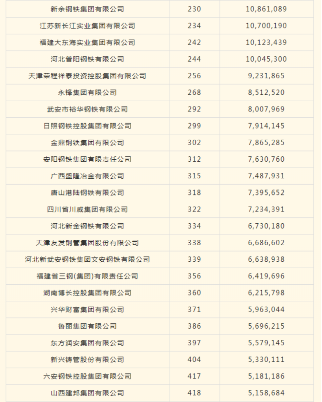 另據了解,今年,製造業企業入圍中國企業500強增至256家,比上年增加7家,依舊占據了中國企業500強“半壁江山”,其中新興鑄管、六安鋼鐵、山西建邦、浙江元立金屬製品、濟鋼集團為新增鋼鐵企業;服務業企業171家,其他企業73家。