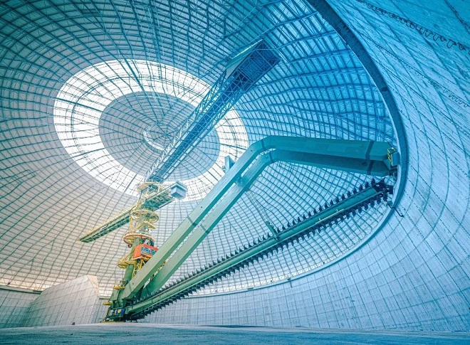 河鋼積極推動和引領行業綠色發展、轉型升級,在國內率先探索和實踐綠色轉型。圖為河鋼智能“無人化”料場。