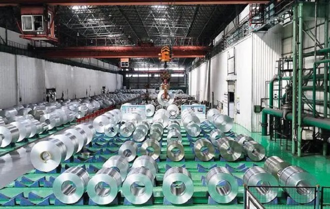 在鞍鋼股份冷軋廠鍍鋅線作業區,吊車搬運鋼卷。(楊青 攝)