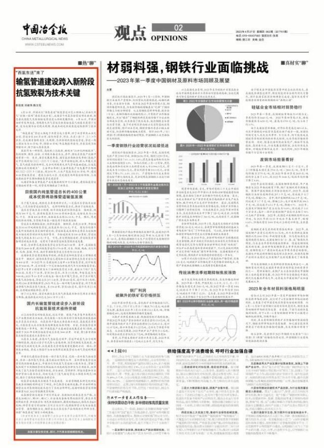 近日,首鋼股份最新研製生產的高鋼級輸氫管線鋼經用戶製管加工後成功應用於包頭—臨河輸氣管道項目,成為國內首家實現高鋼級輸氫管線鋼批量生產的企業,為我國長距離、高壓輸氫管道工程應用奠定基礎。內蒙古包頭—臨河天然氣摻氫管道項目為國內首條高壓力、高鋼級、長距離、大口徑摻氫管道項目,幹線全長約235km,設計壓力6.3MPa,可為沿線地區調整能源結構、實現“碳達峰”“碳中和”提供支撐。項目所應用的Ф457×8.8mm X52MS材質螺旋鋼管由首鋼股份提供板材,華油鋼管製管加工。首鋼股份研發生產的高鋼級輸氫管線鋼,滿足工程設計的10%摻氫比例要求,處於國內領先。
