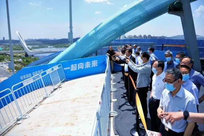 圖為與會人士在首鋼園區調研百年老工業區綠色低碳轉型升級,參觀冷卻塔及周邊冬奧會設施