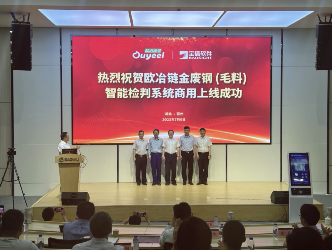 7月6日,歐冶鏈金廢鋼(毛料)智zhi能neng檢jian判pan係xi統tong商shang用yong發fa布bu會hui在zai湖hu北bei鄂e州zhou舉ju行xing。該gai係xi統tong由you歐ou冶ye鏈lian金jin和he寶bao信xin軟ruan件jian聯lian合he研yan發fa,繼ji去qu年nian在zai試shi點dian單dan位wei打da通tong商shang用yong流liu程cheng後hou,此ci次ci在zai中zhong南nan鋼gang鐵tie鄂e城cheng鋼gang鐵tie商shang用yong上shang線xian,成cheng為wei廢fei鋼gang毛mao料liao這zhe一yi複fu雜za料liao型xing智zhi能neng檢jian判pan係xi統tong商shang用yong的de國guo內nei首shou發fa。