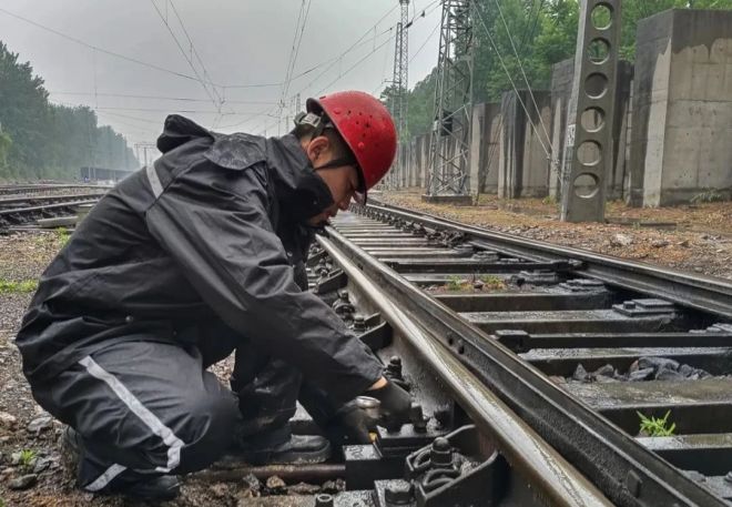 圖為邯鋼職工冒雨正在對轉轍機方鋼螺絲進行檢查維護,確保雨中行車安全。(圖源:河鋼集團)