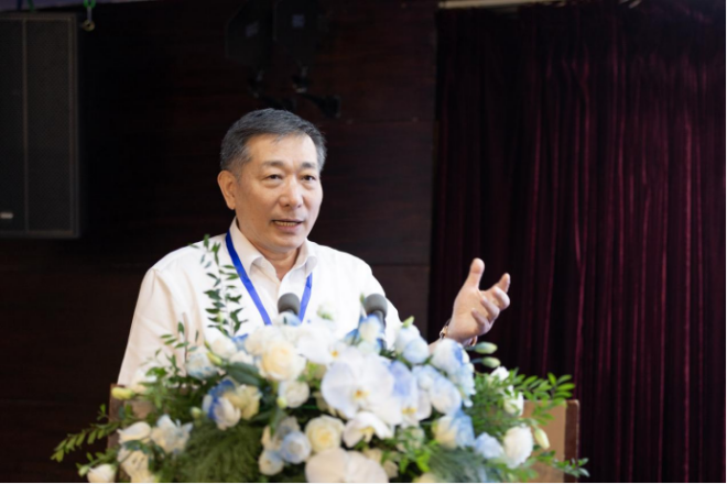 圖為鋼鐵研究總院教授潘濤作題為《釩微合金化熱軋高強鋼筋技術進展》的學術報告。