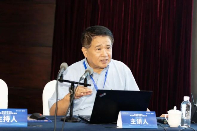 圖為廣西建工智慧製造公司董事長李長國作題為《鋼筋深加工發展過程中的困擾與對策探討》的學術報告。