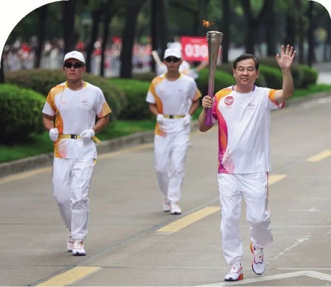9時35分,杭鋼集團黨委書記、董事長張利明作為第30棒火炬手,承載著全體杭鋼人的希望,從上一位火炬手手中接力點火後,向前奔跑。
