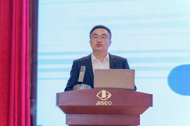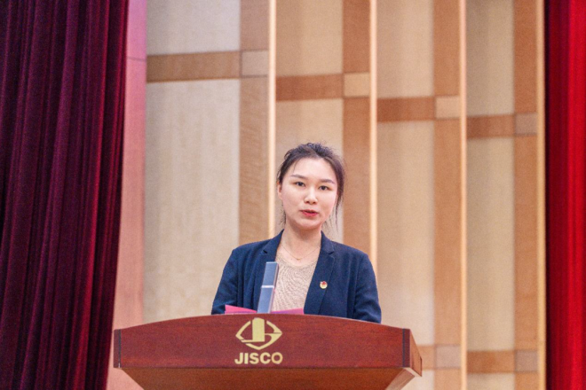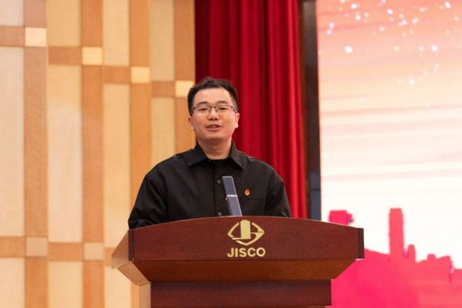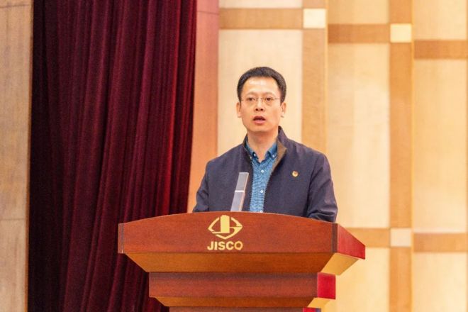 圖為金占雄作題為《聚焦企業戰略目標,創新人才工作機製,用青年力量“火種”點燃酒鋼高質量發展“引擎”》的主旨報告