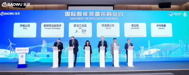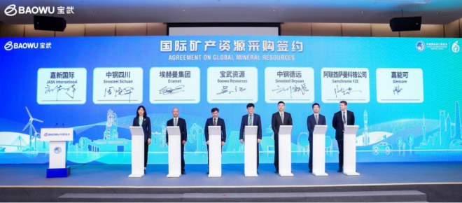 簽約儀式上,寶武與普銳特、特諾恩、索拉斯、中作商事株式會社、德國喬格公司、日本製鐵、蒙古能源、歐亞資源、法國埃赫曼集團、阿聯酋薩曼科鉻公司、嘉能可、嘉新國際等全球知名供應鏈合作夥伴進行了國際智能裝備、國際礦產及生產資源簽約,涉及新能源汽車用無取向矽鋼產線設備,優質焦煤、錳礦、鉻鐵、鎳鐵、鐵礦石等資源,以及熱軋原板等生產性資源,預計不低於上一屆央企交易團寶武分團采購金額水平。寶鋼股份、八鋼公司、寶武資源、中鋼集團、歐冶工業品等寶武相關子公司分別與相關合作夥伴簽署采購協議。