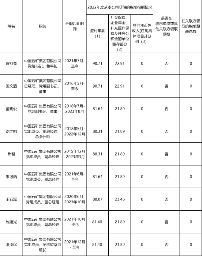 中國五礦集團有限公司企業負責人2022年度薪酬情況