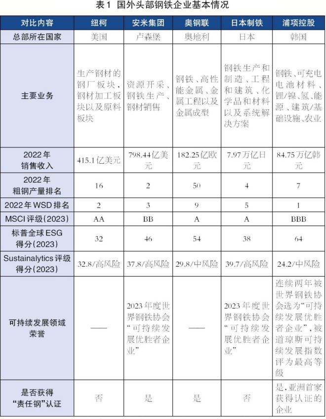 本文選取5家國外頭部鋼鐵企業,對比分析其可持續發展框架、ESG報告(含可持續發展報告和社會責任報告)的形式和主要內容,希望對國內鋼鐵企業ESG實踐和信息披露有所借鑒。