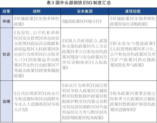 此外,為更好地約束企業行為,切實踐行可持續發展理念,紐柯、安米集團以及浦項控股還製訂了完善的ESG製度體係,並且持續根據ESG相關全球倡議進行修訂,具體如表3所示。例如,安米集團的可持續發展政策涵蓋了人權、反腐敗、衝突礦產、商業行為、負責任采購、健康與安全及環境等方麵,浦項控股形成了包含環境、社會和治理3個維度共計14個具體製度的政策手冊。