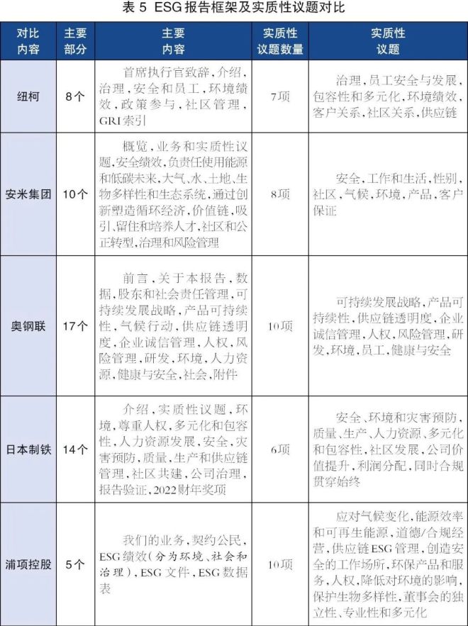 5家國外頭部鋼鐵企業ESG報告的框架如表5所示,可以發現: