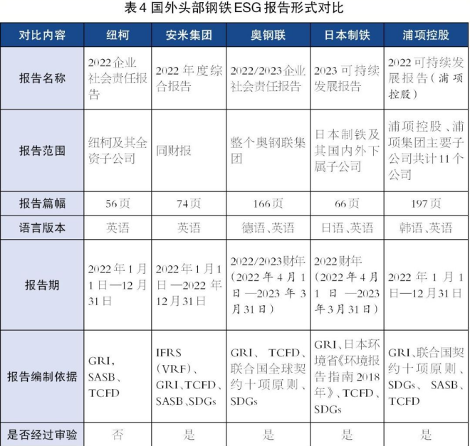 通過對比5家國外頭部鋼鐵企業的ESG報告(如表4所示),可以發現: