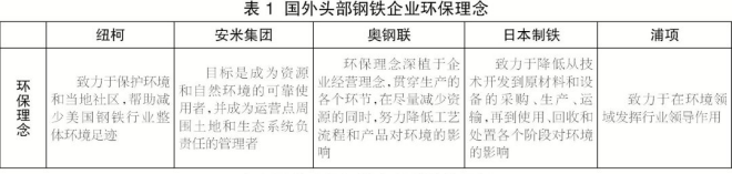 在環保理念方麵,國外頭部鋼鐵企業將環保理念融入企業戰略、生產和經營,致力於減小對環境的影響(見表1)。