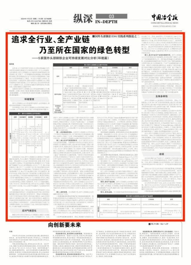 在(zai)環(huan)境(jing)問(wen)題(ti)日(ri)益(yi)嚴(yan)峻(jun)的(de)當(dang)下(xia),低(di)碳(tan)和(he)可(ke)持(chi)續(xu)發(fa)展(zhan)已(yi)成(cheng)為(wei)全(quan)球(qiu)各(ge)行(xing)各(ge)業(ye)共(gong)同(tong)的(de)挑(tiao)戰(zhan)和(he)追(zhui)求(qiu),需(xu)要(yao)產(chan)業(ye)鏈(lian)攜(xie)手(shou)攻(gong)堅(jian)。目(mu)前(qian),國(guo)外(wai)主(zhu)要(yao)鋼(gang)鐵(tie)企(qi)業(ye)在(zai)環(huan)境(jing)管(guan)理(li)、應對氣候變化和生物多樣性保護等方麵采取了一係列創新和前瞻性的措施。