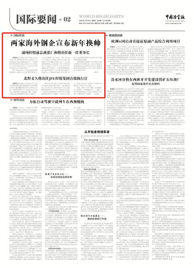 本報訊 JFE鋼鐵公司內部人員2月22日向筆者透露,JFE控股集團將任命其鋼鐵業務部門(JFE鋼鐵公司)負責人北野義久為新一任集團首席執行官,任命自4月1日起生效。JFE鋼鐵公司副總裁廣瀨正之(Hirose Masayuki)將接替擔任北野義久現職務。