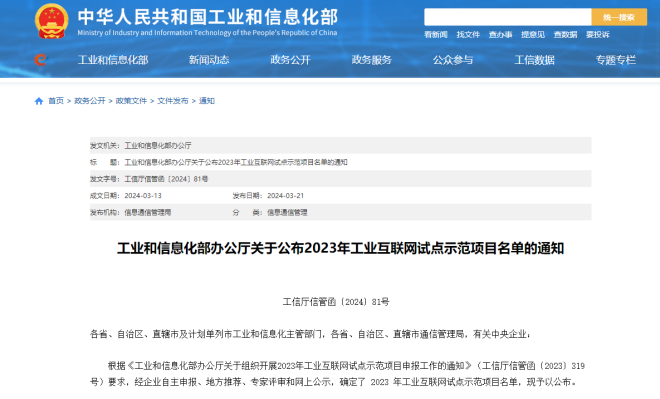 關於公布2023年工業互聯網試點示範項目名單的通知