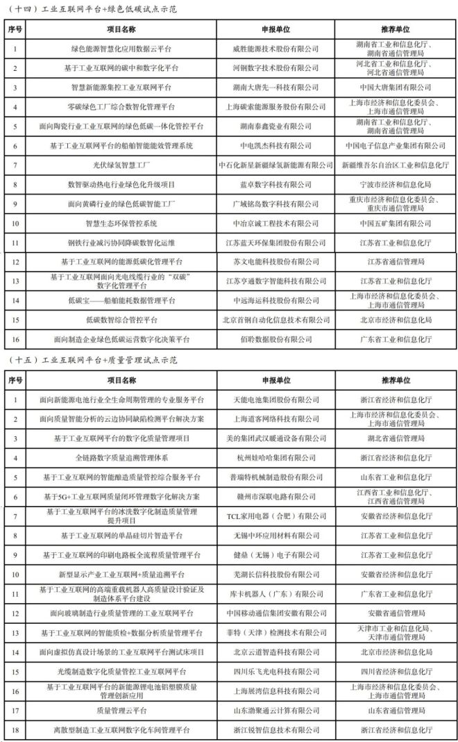 根據《工業和信息化部辦公廳關於組織開展2023年工業互聯網試點示範項目申報工作的通知》(工信廳信管函〔2023〕319號)要求,經企業自主申報、地方推薦、專家評審和網上公示,確定了 2023 年工業互聯網試點示範項目名單,現予以公布。