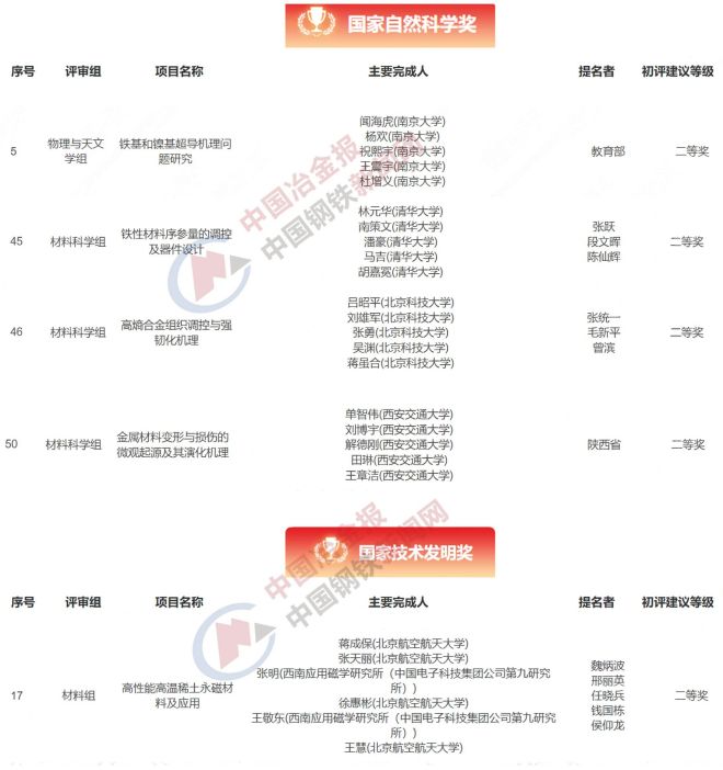 4月8日,科學技術部發布《國家科學技術獎勵工作辦公室公告第100號》,公告顯示2023年度國家科學技術獎初評工作已經結束。初評共通過國家自然科學獎通用項目59項、國家技術發明獎通用項目52項、國家科學技術進步獎通用項目132項,均在國家科技管理信息係統公共服務平台(https://service.most.gov.cn/jl)予以公布。其中,涉及鋼鐵相關領域的國家自然科學獎項目共4項、國家技術發明獎1獎、國家科學技術進步獎項目7項!