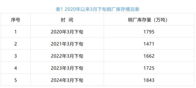從企業庫存情況來看,3月下旬,重點統計鋼鐵企業鋼材庫存量1843萬噸,比去年同期增加117萬噸,增長10.88%,鋼材庫存量為曆史同期最高(見表1)。一季度,鋼材平均庫存1683.7萬噸,比去年同期減少53萬噸,下降3.07%。