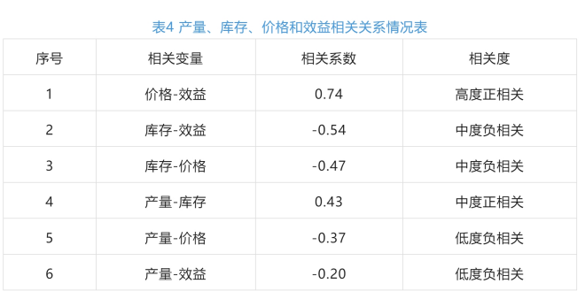 從產量與庫存、價格、效益之間的相關性關係及運行邏輯來看(見表4),產量的增長可能導致庫存積壓(相關係數0.43),庫存的增加往往伴隨著銷售價格的下滑(相關係數-0.47),價格下滑最終會導致企業效益的下降(相關係數0.74)。