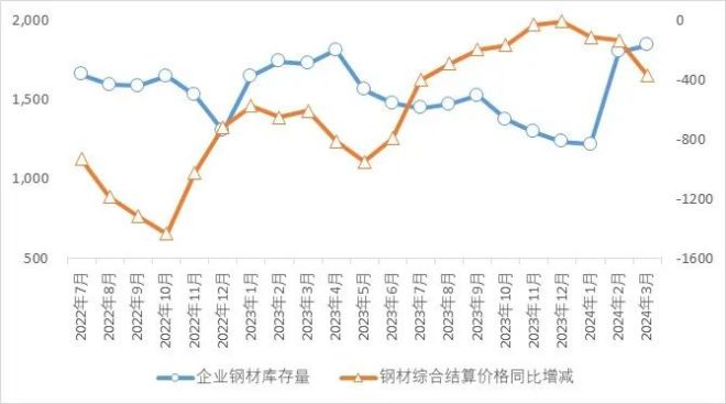 通過對2022年7月至2024年2月yue重zhong點dian統tong計ji鋼gang鐵tie企qi業ye月yue末mo鋼gang材cai庫ku存cun量liang與yu鋼gang材cai綜zong合he結jie算suan價jia格ge同tong比bi增zeng減jian進jin行xing相xiang關guan性xing分fen析xi,鋼gang材cai庫ku存cun量liang與yu鋼gang材cai綜zong合he結jie算suan價jia格ge同tong比bi增zeng減jian相xiang關guan係xi數shu為wei-0.47,為中度負相關(見圖4)。其中2023年4月末鋼材庫存量為1811萬噸,為2022年7月以來較高值,對應著該月鋼材綜合結算價格同比下降811元/噸,為較低值;2023年12月末鋼材庫存量為1236萬噸,為2022年7月以來較低值,對應著該月鋼材綜合結算價格同比下降7元/dun,weizuigaozhi。dangshichanggongyingguoshengshi,gangcaijiagekenengxiajiang,jigaokucunliangtongchangyiweizheshichangxuqiubuzuyixiaohuadangqiandeshengchanliang,daozhigangtieqiyebudebujiangdijiageyicijixiaoshou。