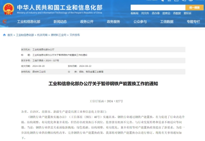 8月23日,工信部網站發布關於暫停鋼鐵產能置換工作的通知。通知明確,各地區自2024年8月23日起,暫停公示、公告新的鋼鐵產能置換方案。未按通知要求,繼續公示、公告鋼鐵產能置換方案的,將視為違規新增鋼鐵產能,並作為反麵典型進行通報。