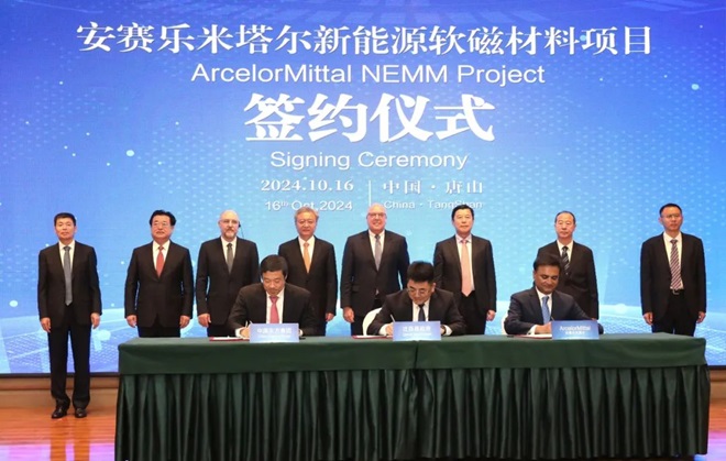 10月16日,全球鋼鐵巨頭安賽樂米塔爾(簡稱“安米”),攜手中國東方集團(香港)投巨資合作打造的新能源軟磁材料項目簽約活動在唐山舉行,這標誌著高端、綠色、智能化、數字化的新能源軟磁材料項目,在河北唐山和江蘇常州正式落地、全麵推進。據悉,這是近年來歐洲企業在華投資的最大項目之一,也是國內鋼鐵行業引進外商直接投資的最大項目之一。