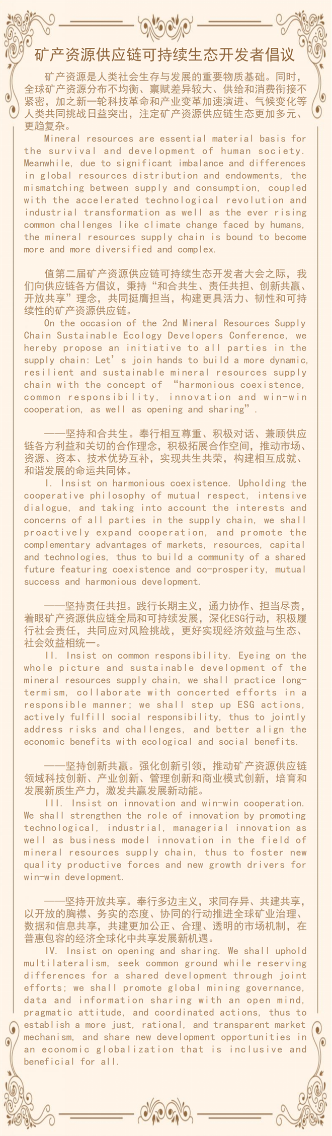 11月7日,在第二屆礦產資源供應鏈可持續生態開發者大會上,中國礦產資源集團、中國鋼鐵工業協會共同發布《礦產資源供應鏈可持續生態開發者倡議》。