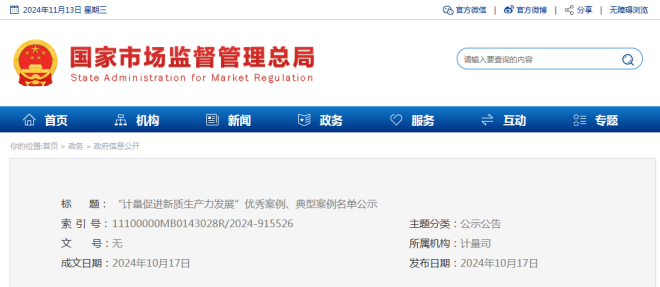 近日,國家市場監督管理總局發布了《“計量促進新質生產力發展”優秀案例、典型案例名單公示》(以下簡稱“公示”)。