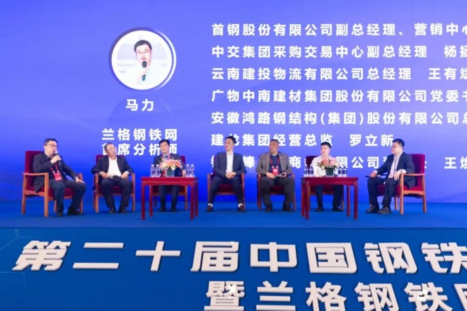 在高端對話環節,首鋼股份有限公司副總經理、營銷中心總經理趙鵬,中交集團采購交易中心副總經理楊拯,廣東廣物中南建材集團有限公司黨委書記、董事長胡灝,安徽鴻路鋼結構(集團)股份有限公司總經理王軍民,建龍集團經營總監羅立新,鋼棒棒電子商務有限公司董事長王煥友等,圍繞鋼材進出口、供需格局演變、企業經營模式及後市行情等話題展開深入交流。蘭格鋼鐵網首席分析師馬力主持該環節。